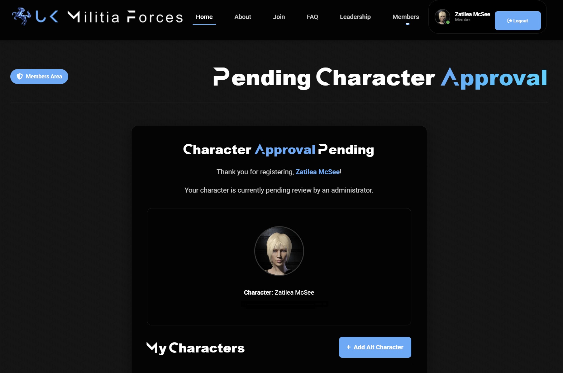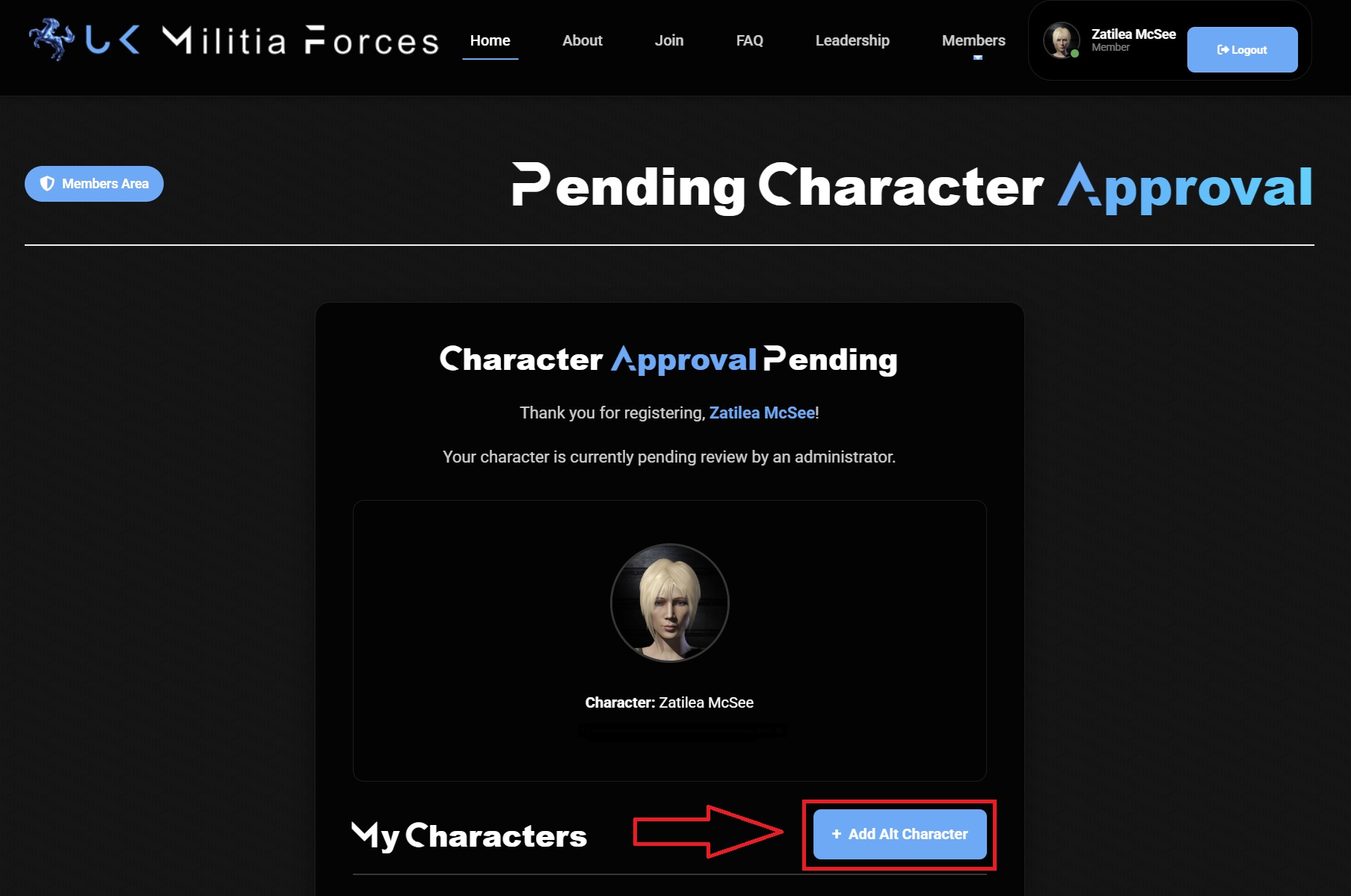 Our leadership team will review your application, and you’ll be notified of the decision. The Pending Character Approval page also confirms your application has been received.