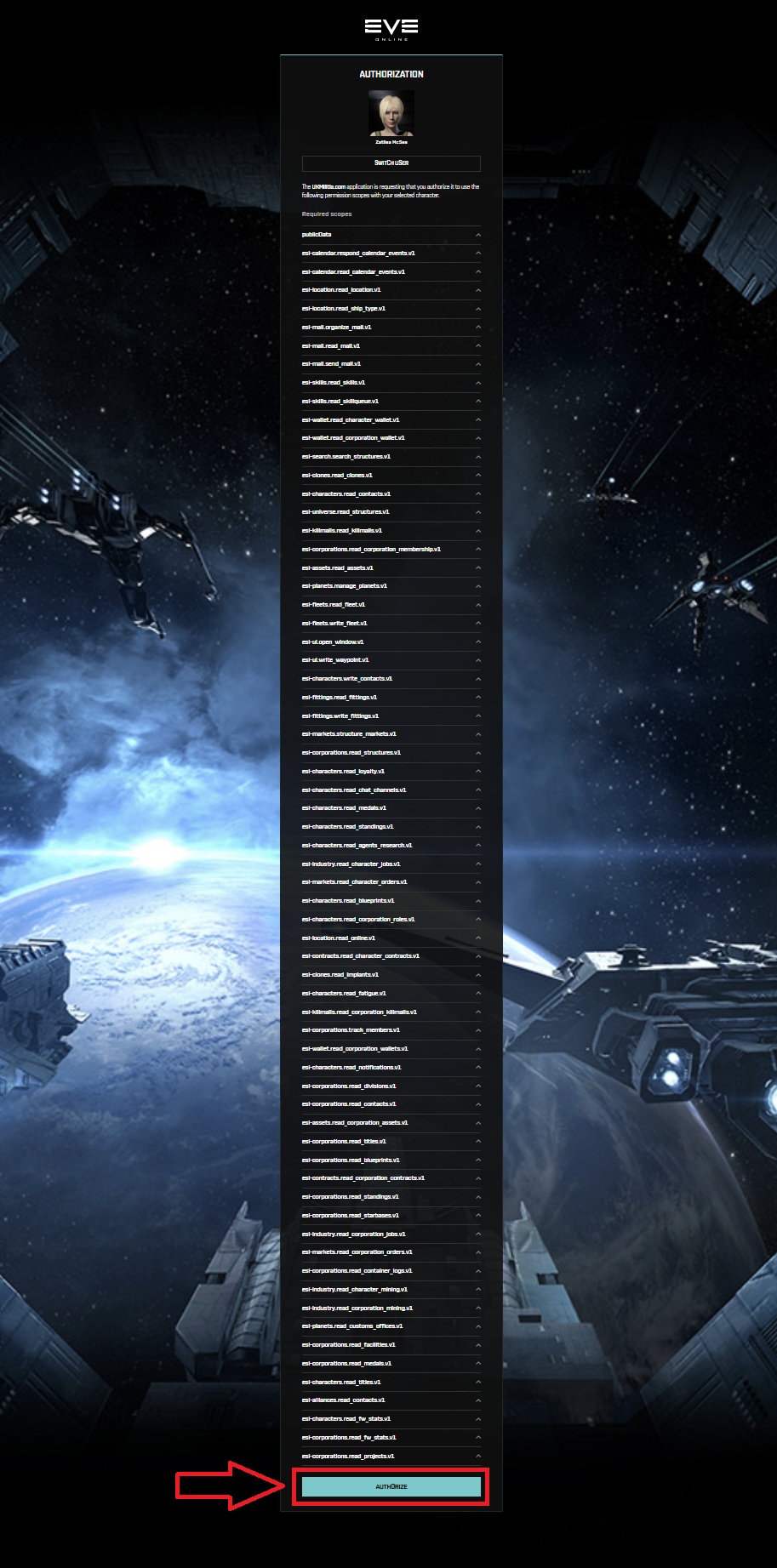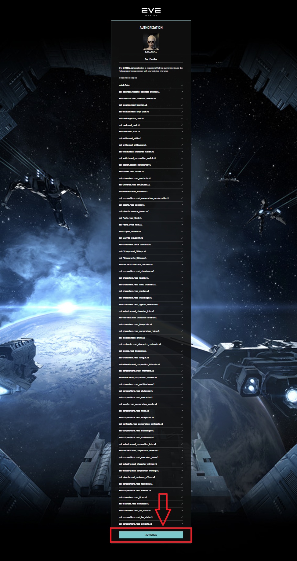 6.4 Scroll to the bottom and Authorize ESI Roles for your ALT character and repeat for all characters within that Eve Online Account.